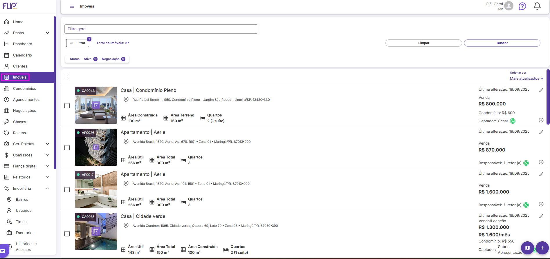 - Fechamento: O status mudará de "Ativo em Negociação" para "Vendido" ou "Locado".
