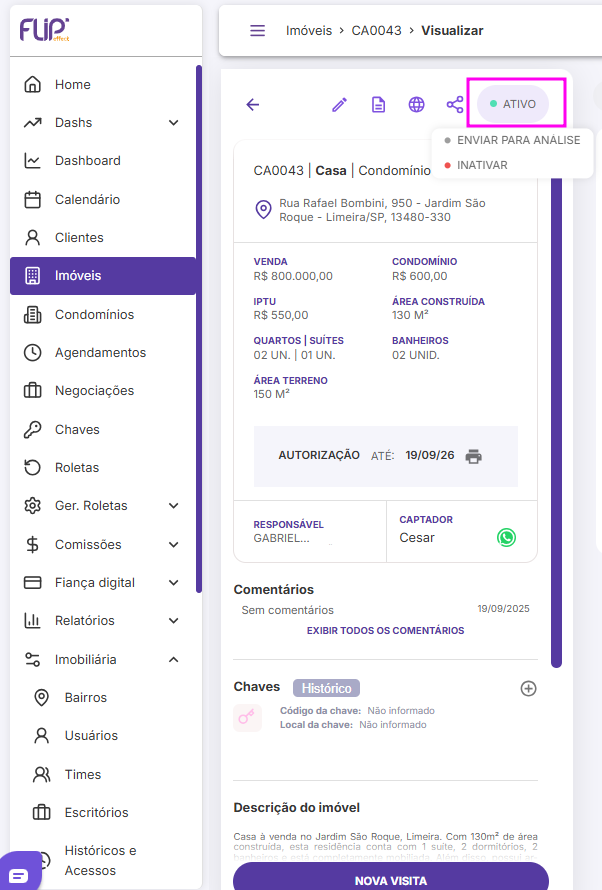 | Ativo | Imóvel autorizado pela gerência para venda ou locação. |