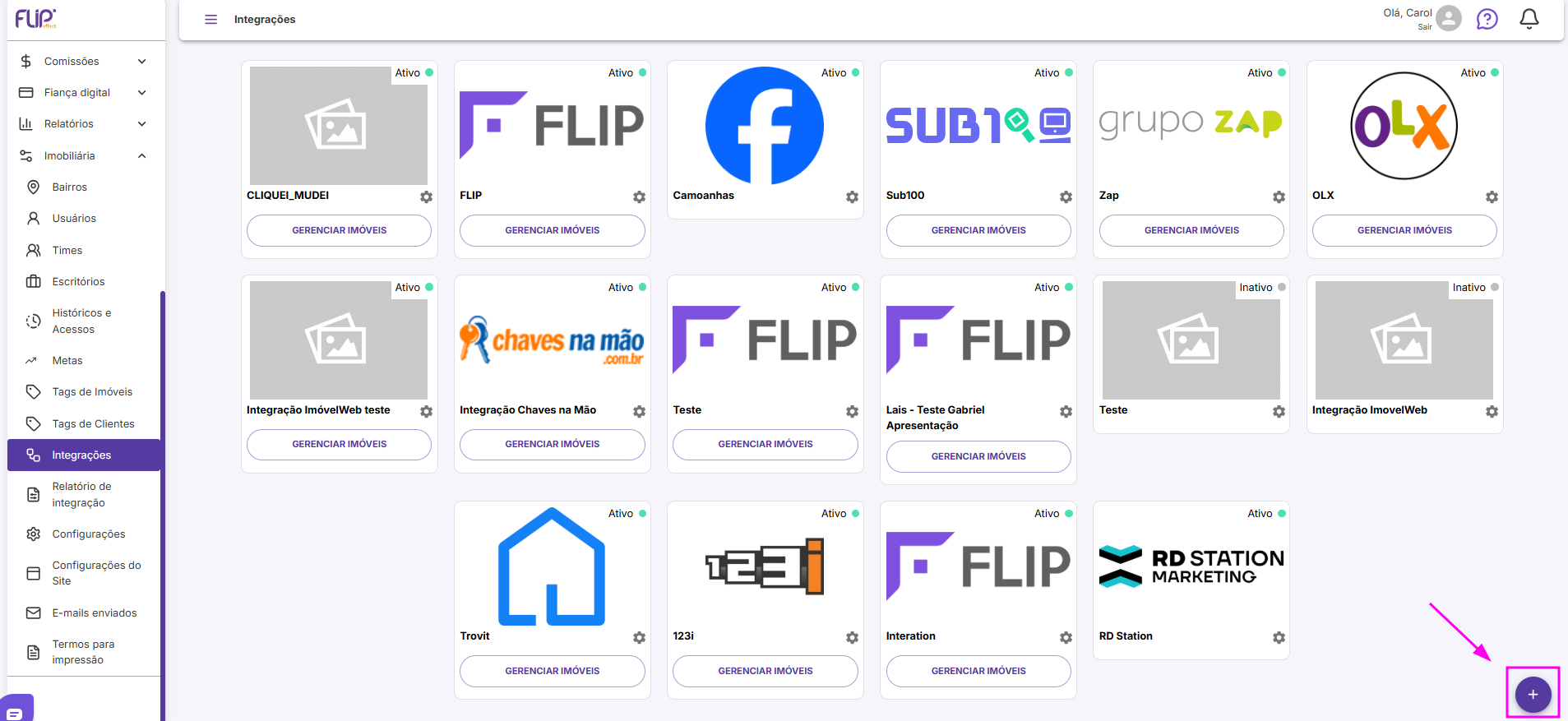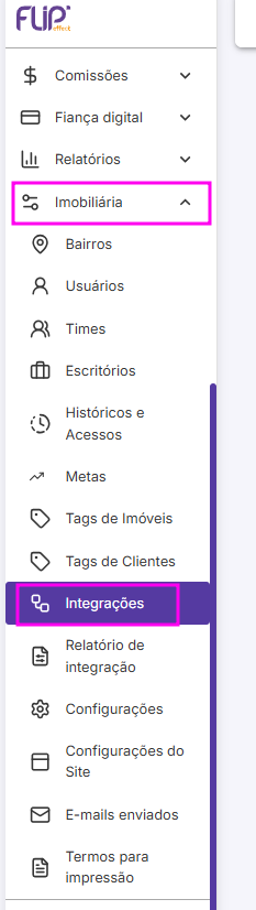 Para realizar a integração do Sub100 com o CRM, você precisa encontrar o módulo de Integrações, localizado na sessão “Imobiliária"