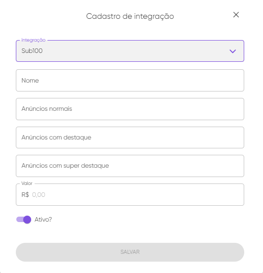 Assim que clicar no ícone de adição aparecera uma janela, de Cadastro de integrações, opte por selecionar no campo de integração "Sub100" e realize o preenchimento dos demais campos.