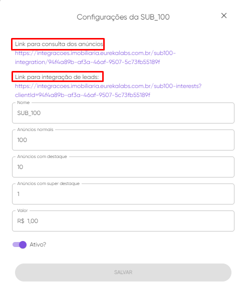 Assim que abrir vai aparecer dois links, um referente a anúncios e o outro sobre lead. É necessário que copie os dois links e envie para o suporte da Sub100, para que eles finalizem a integração dos portais.
