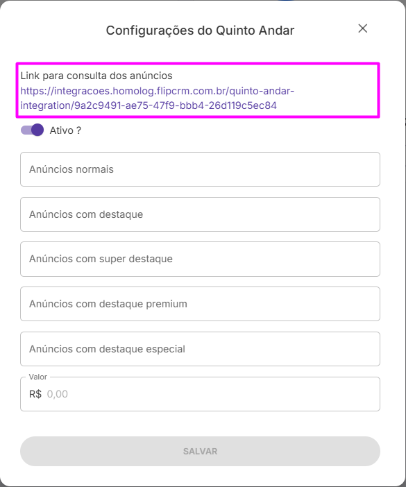 Como estamos realizando a integração do tipo Quinto Andar, no campo de "Integração" você deve selecionar "Quinto Andar".